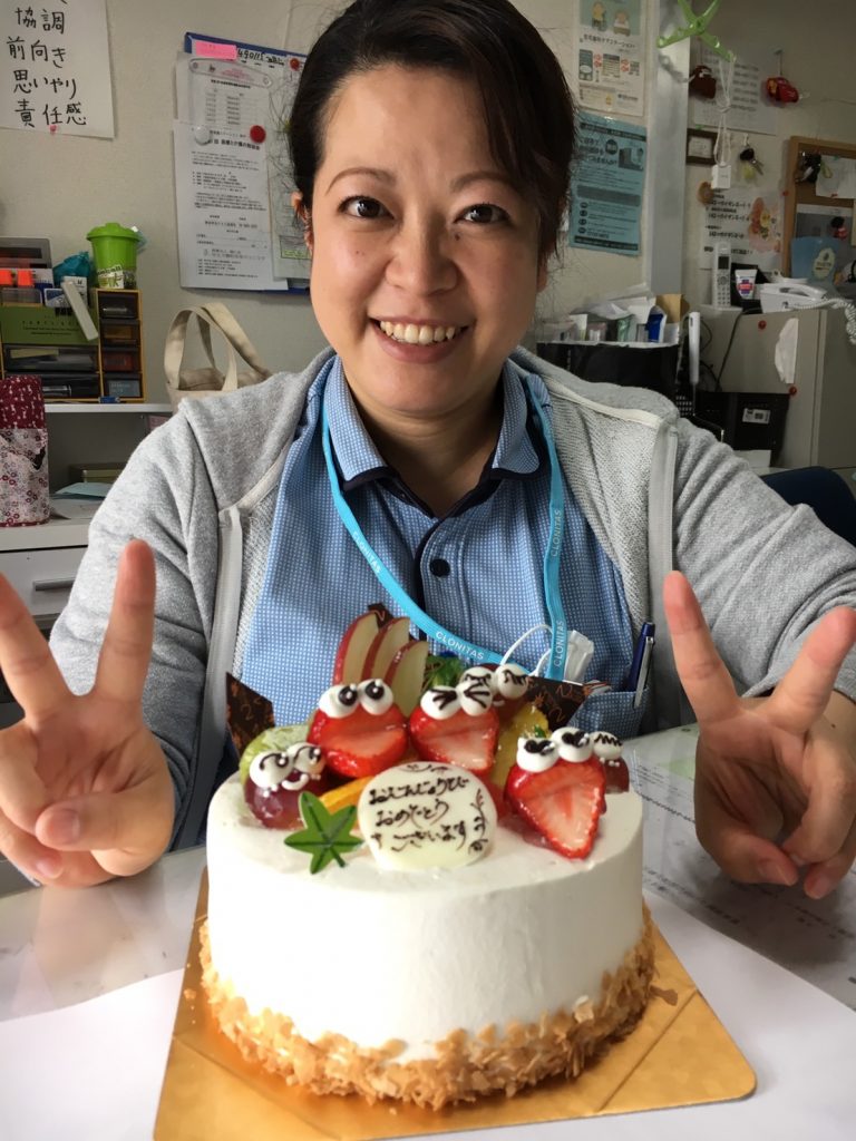 こんにちは、箕面のファミフル訪問看護ステーションです。今回は当ステーションのプライベートな話題です。4月21日は、我がステーションの大黒柱、管理者の山下看護師の?0歳のお誕生日でした。開設以来、仕事と⒊人の子育てに奮闘し休む暇もなく働いている山下看護師にスタッフからかわいいケーキのプレゼントがありました。写真は大好きなケーキとスタッフの優しい気持ちに満面の笑みの山下看護師です。これからも利用者様やスタッフからそして母親として愛され、頼られるように頑張ってほしいと思います。