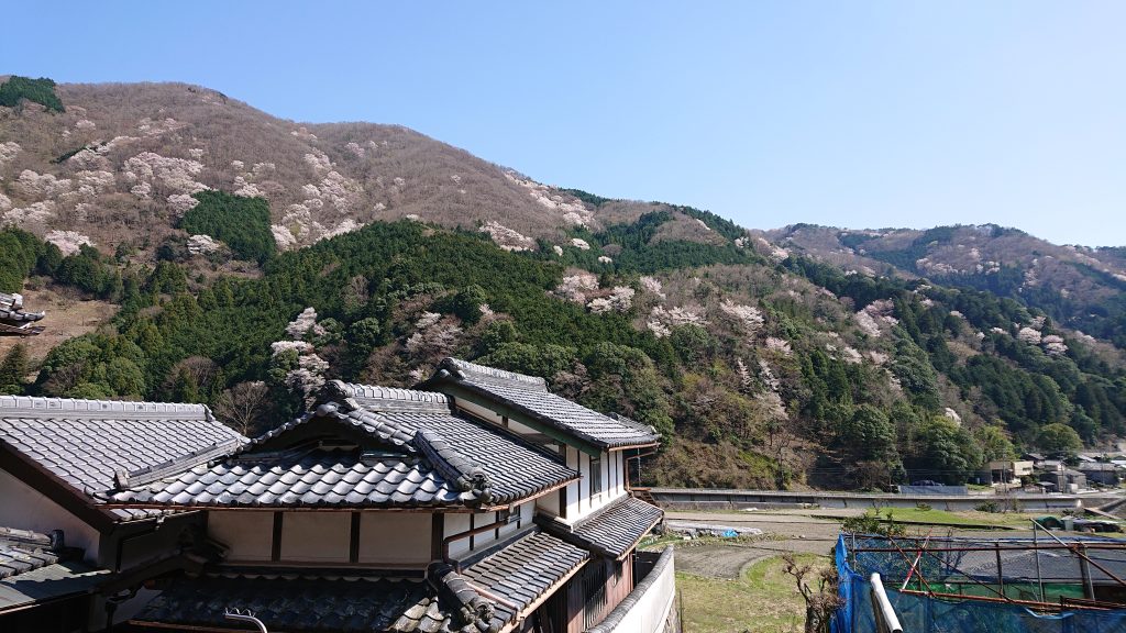 写真は箕面グリーンロードのトンネルを抜けた先、止々呂美周辺です。緑の中に数多の山桜が咲いており、目を奪われるようななんとも素敵な光景です。