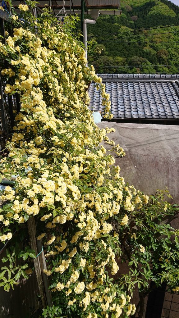 写真は箕面市とどろみにある利用者様のお宅で撮影させて頂きました。モッコウバラといってバラですがトゲがないと教えて頂きました。これだけ咲くと見事ですね。